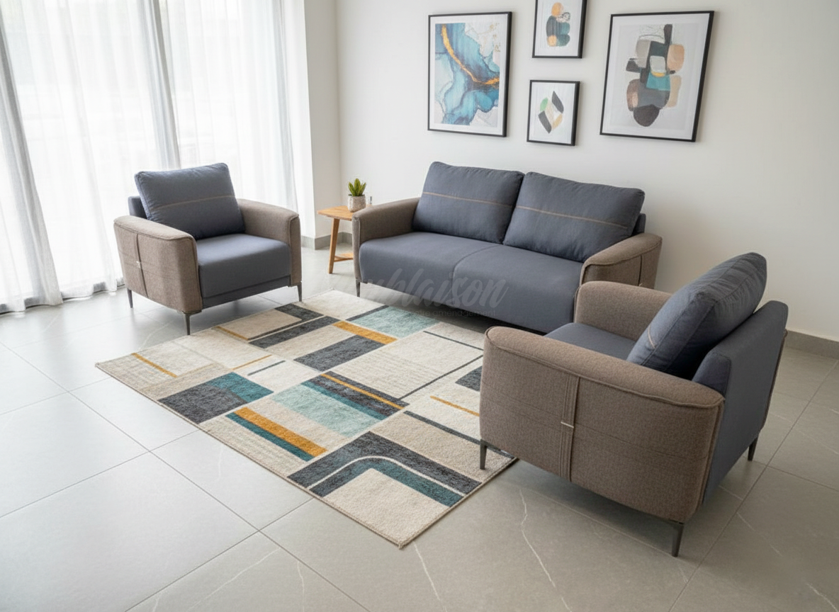 Nombre de places : 5 (Canapé 3 places + 2 fauteuils).