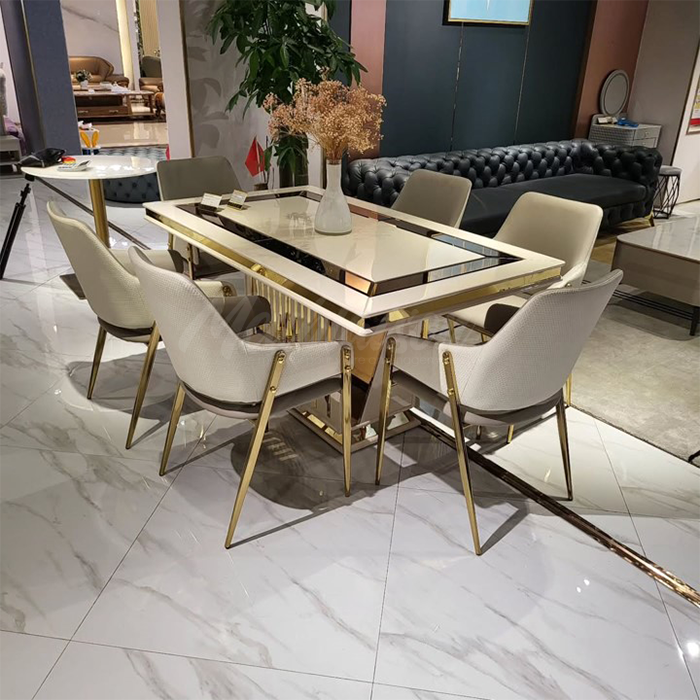 Cette salle à manger arbore un style moderne et luxueux, caractérisé par un mélange élégant de tons neutres et d’accents métalliques. Elle dégage une atmosphère à la fois sophistiquée et épurée.